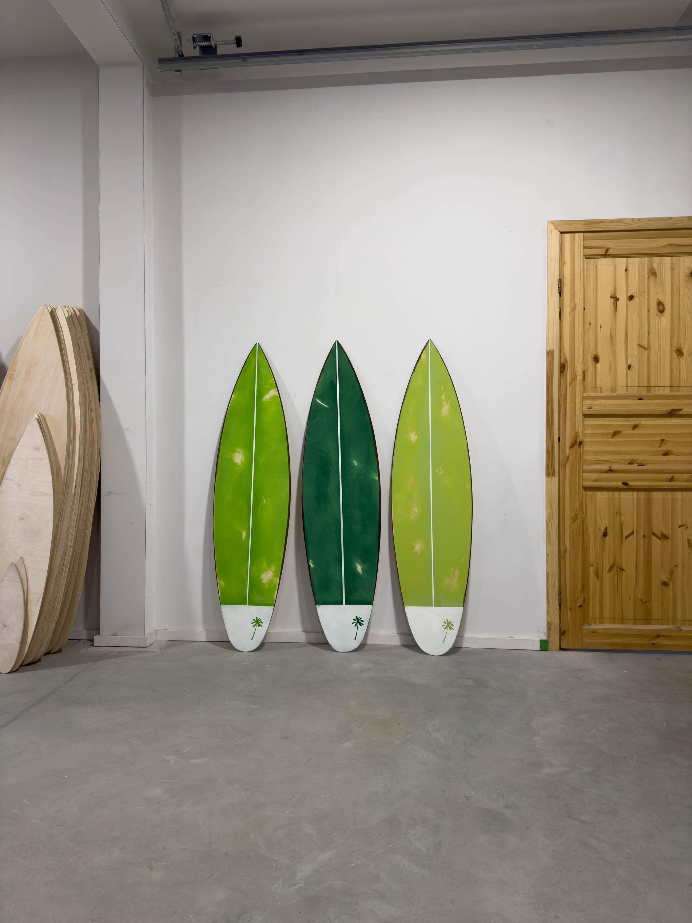 Wooden Decorative Surfboard in shades of green and Vintage signs of wear.