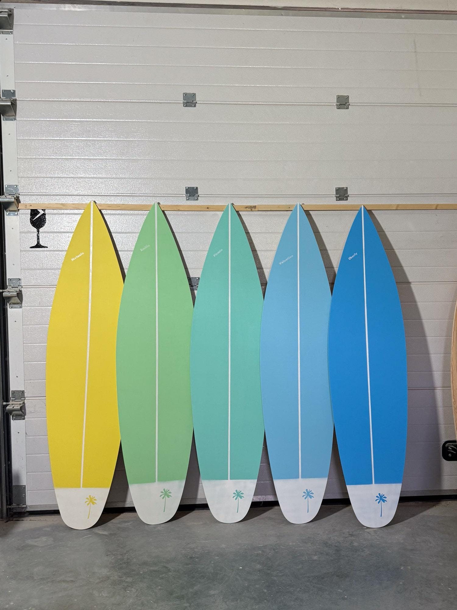 Handcrafted wooden decorative surfboard wall art in different sizes and colors. It's possible to add custom text or logo by your request or keep it just with the palm.