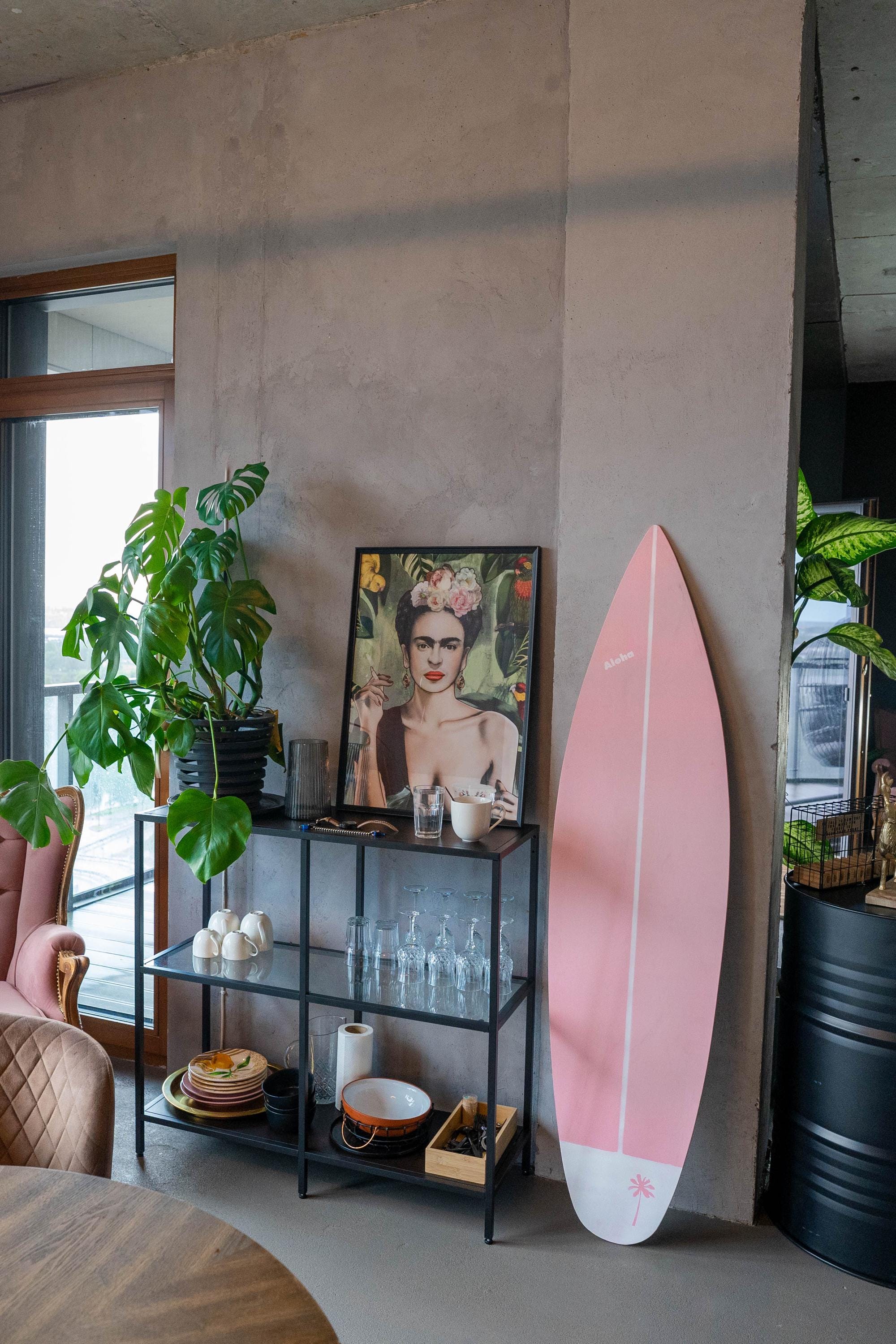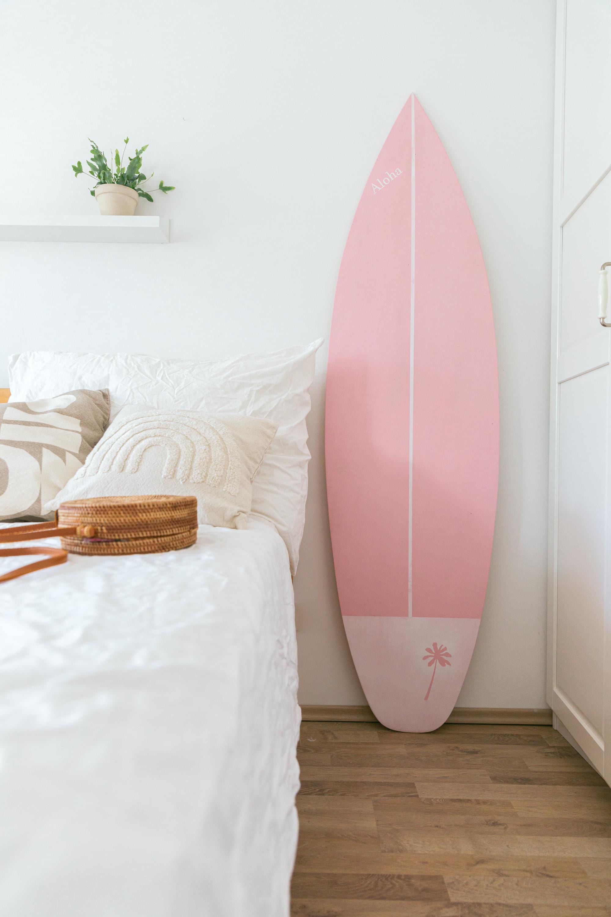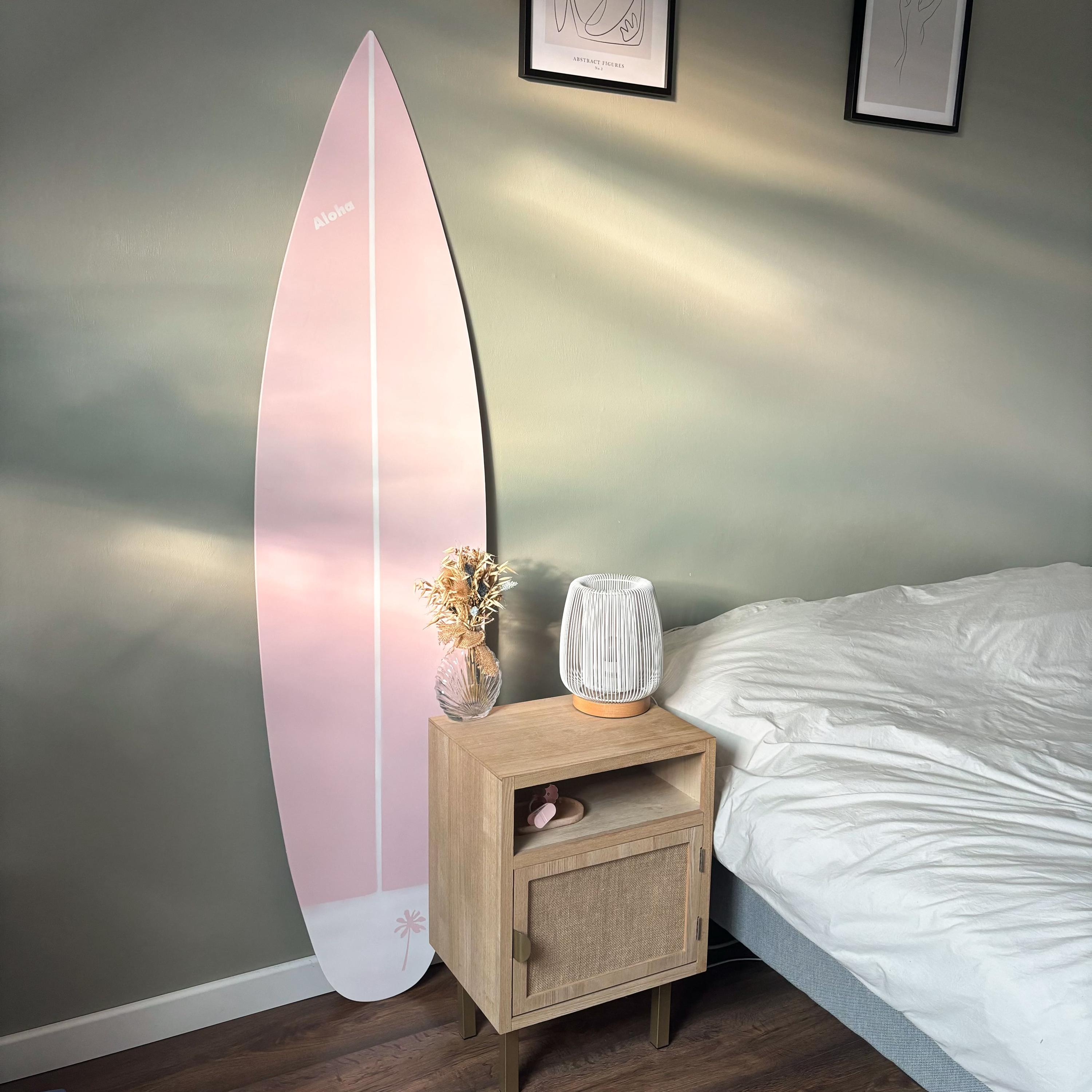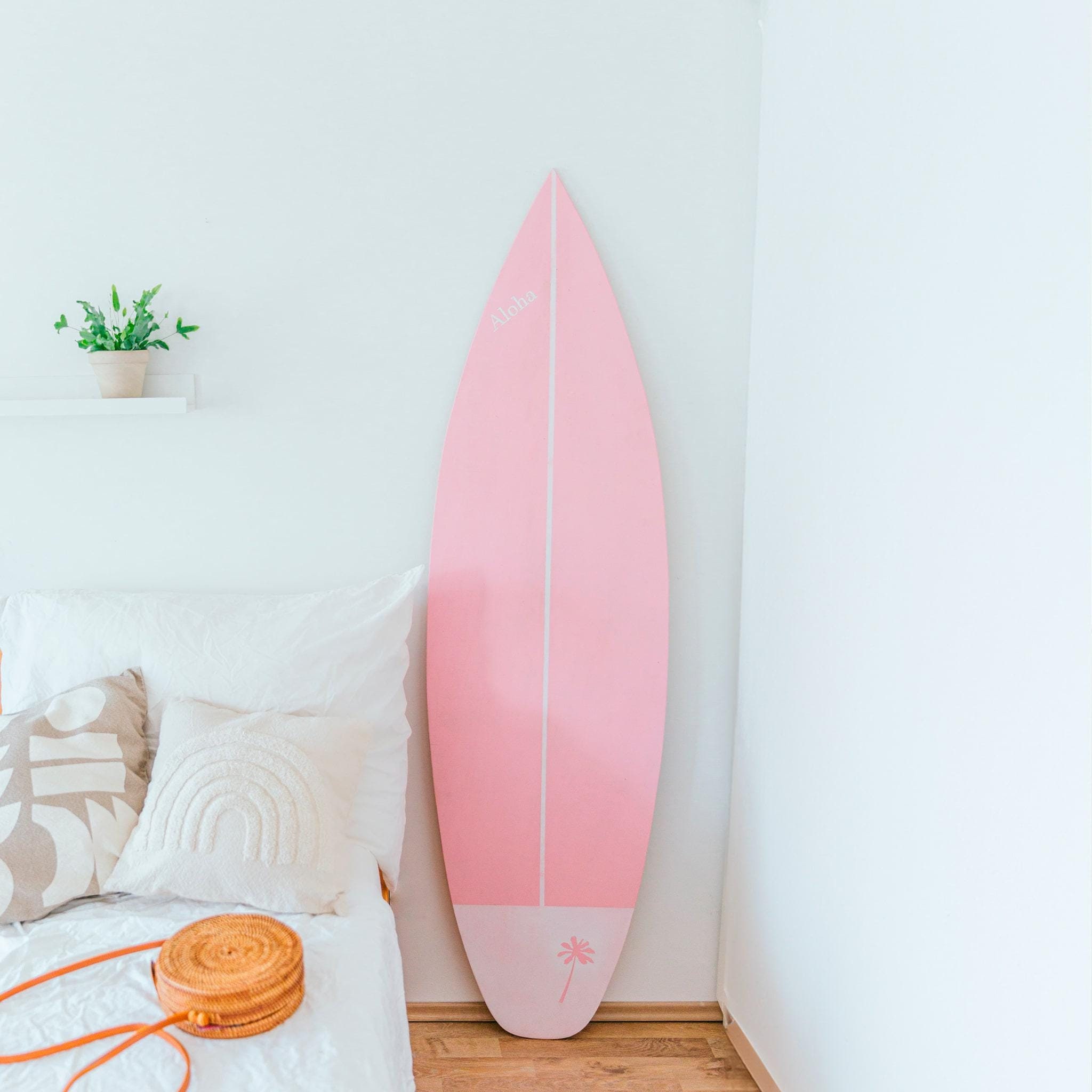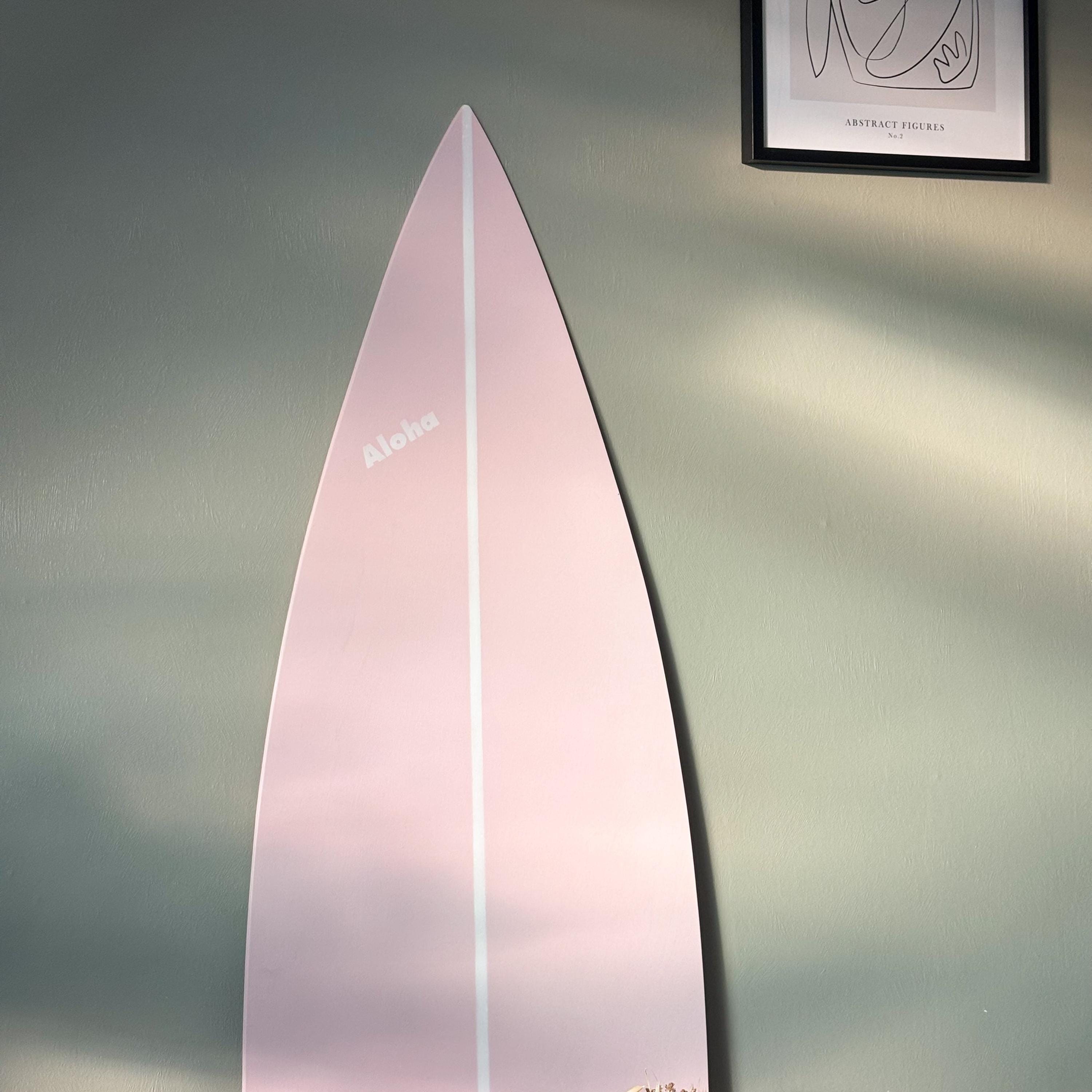 Handcrafted wooden decorative surfboard in baby pink color. Available in different sizes with vertical and horizontal wall hanger option. You can add custom text, name or logo by your request.