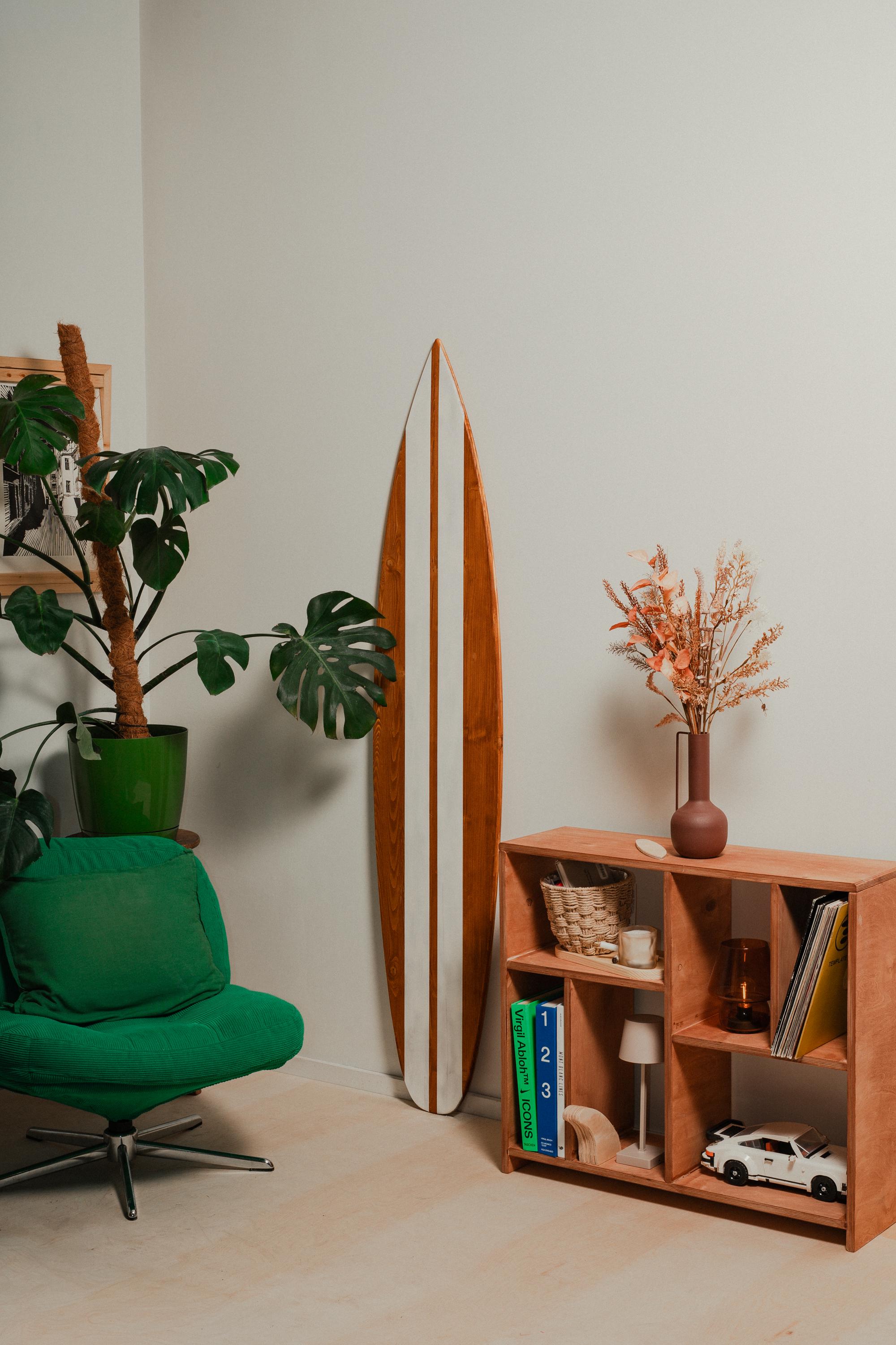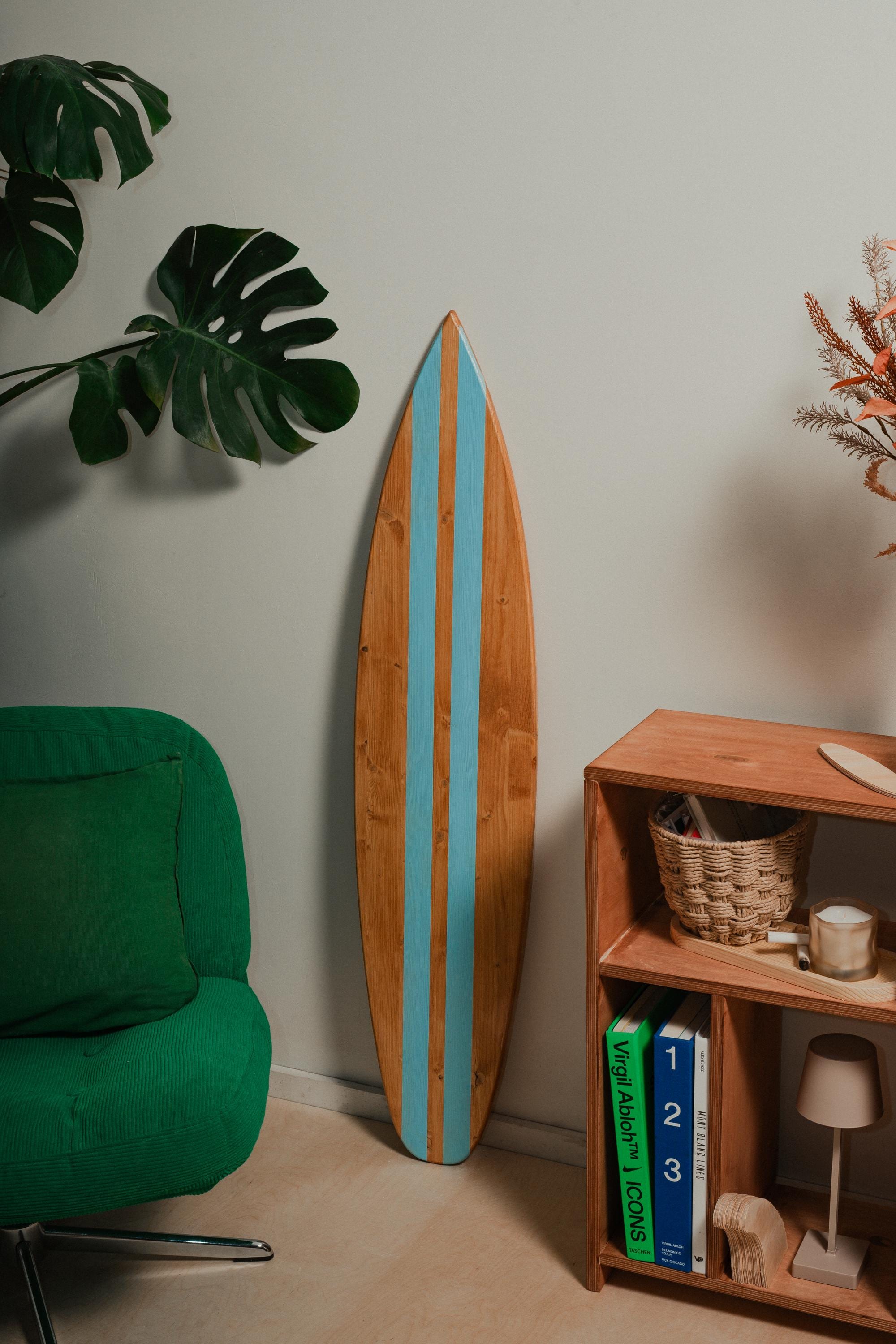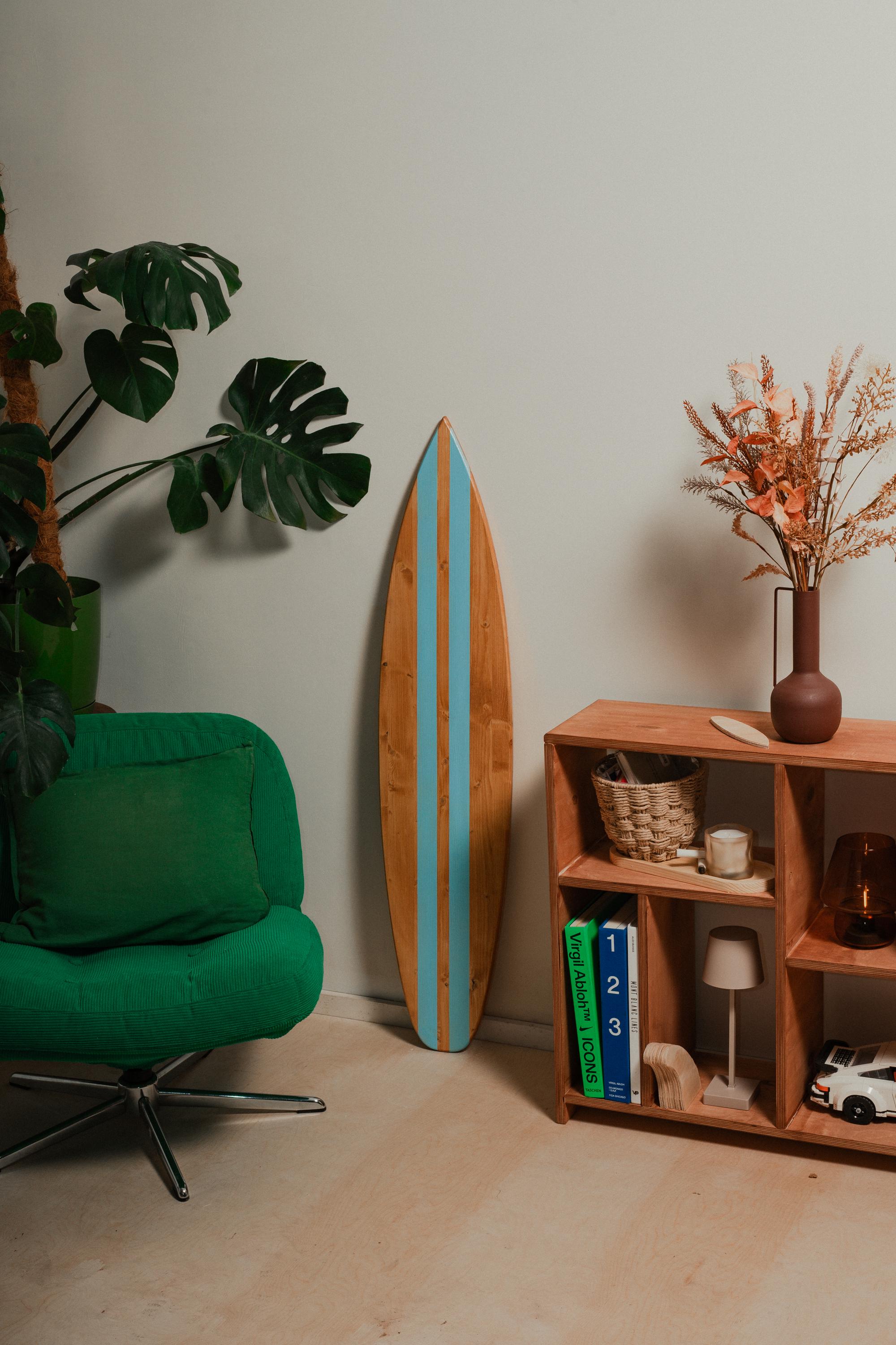 Made from FSS pine wood with rich warm teak oil stain and clean white center stripes, this decorative surfboard brings instant coastal character to any space. It’s available in different sizes, simple, and eye-catching without being loud — the kind of piece people notice the second they walk into the room.