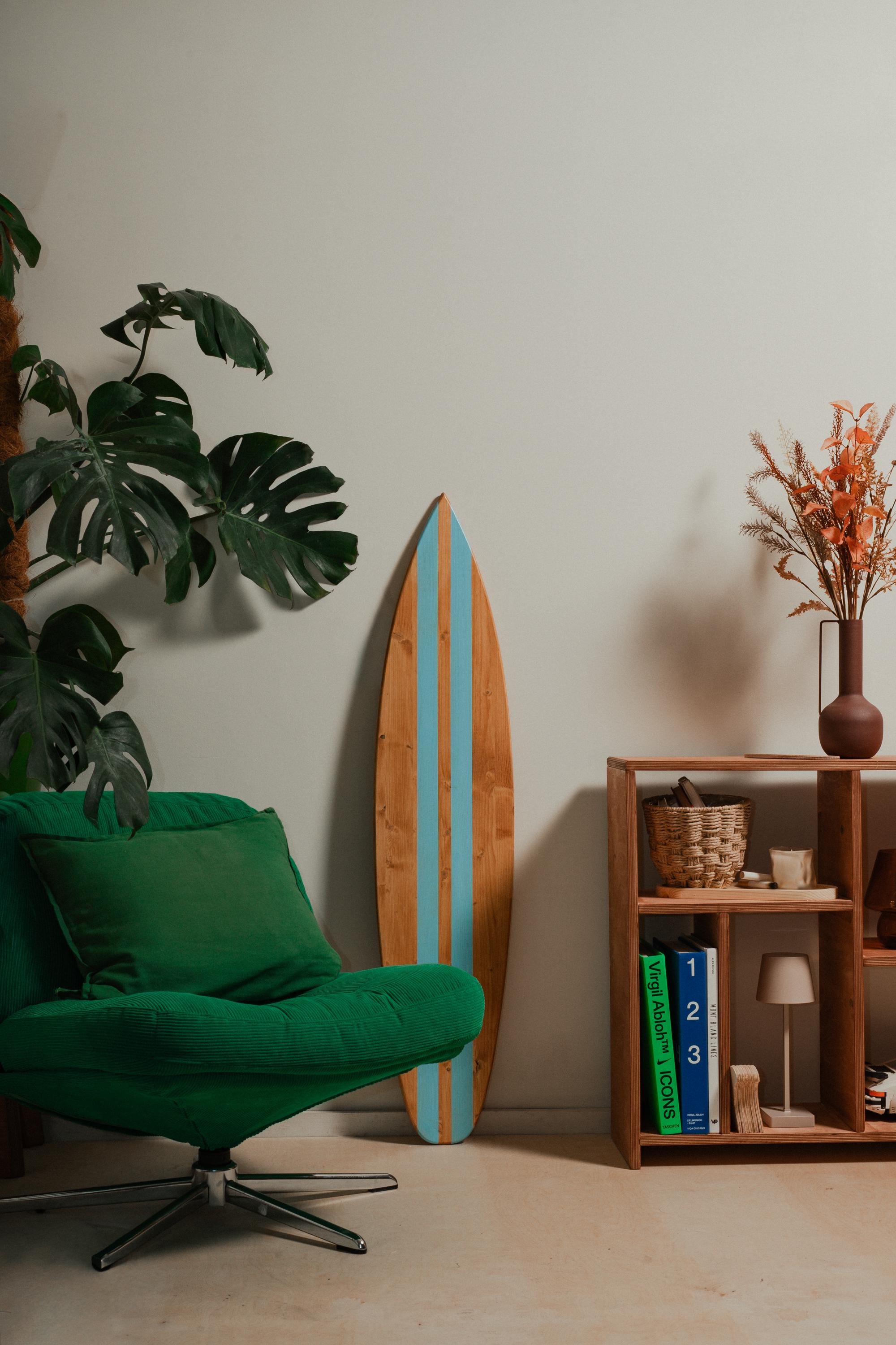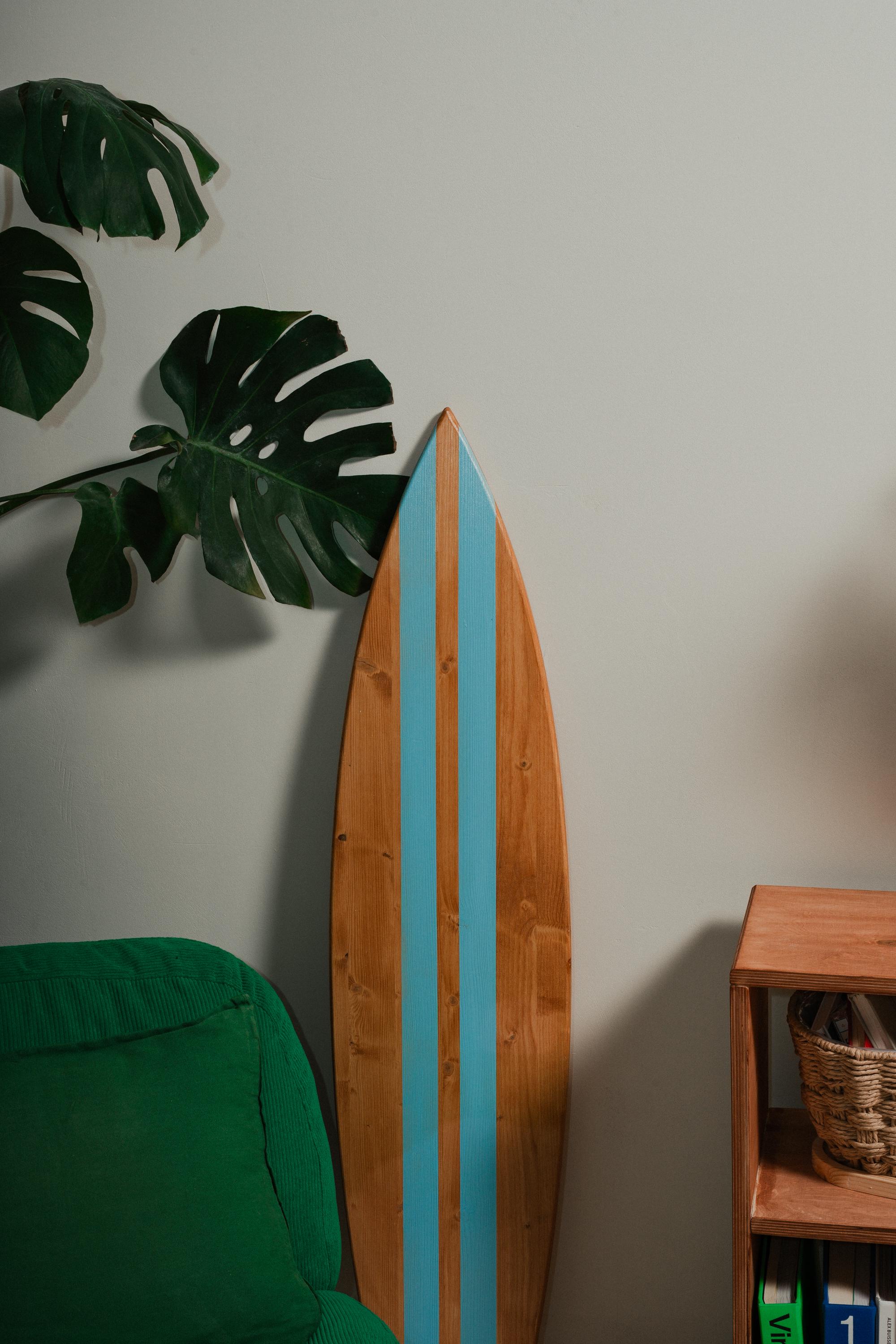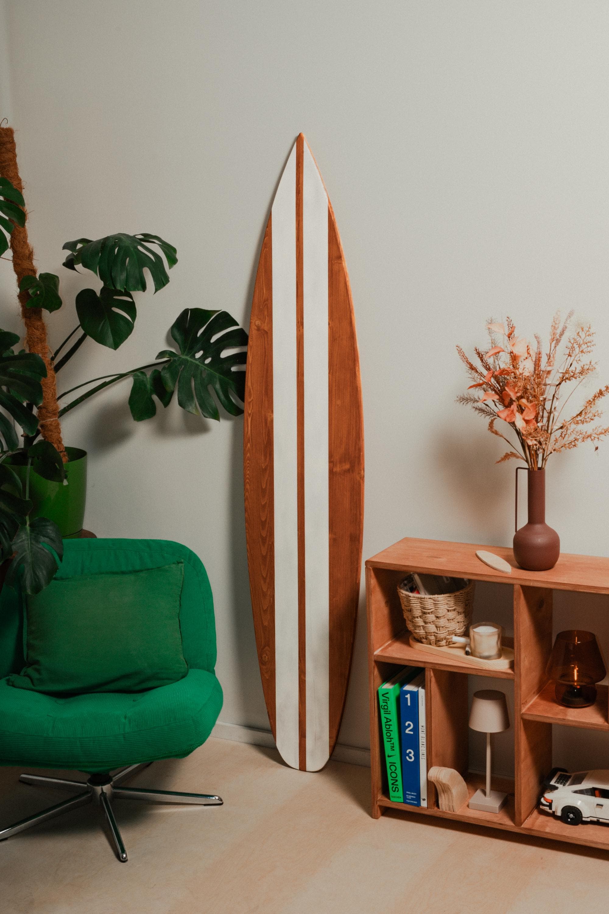 Made from FSS pine wood with rich warm teak oil stain and clean white center stripes, this decorative surfboard brings instant coastal character to any space. It’s available in different sizes, simple, and eye-catching without being loud — the kind of piece people notice the second they walk into the room.